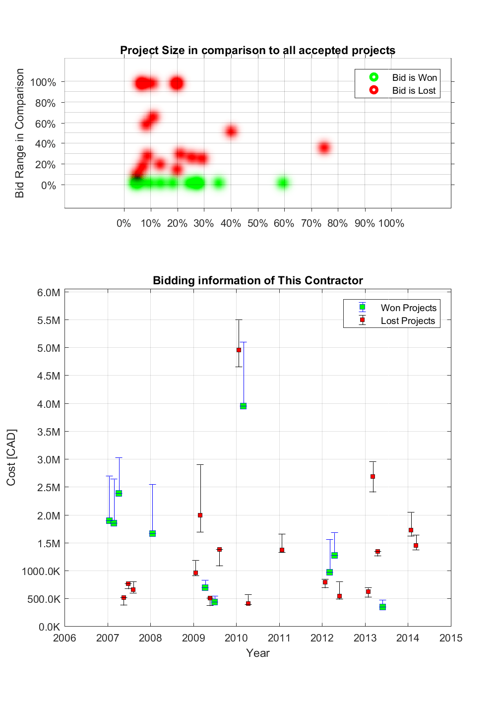 Our propriety machine learning algorithm can help you develop metrics that quantify the statistical behaviour of contractors from your historical tender/bid summaries. Anomalous bids can be defensibly discarded. Winning bids can be justified on the basis of historic behaviour under competitive market dynamics.
